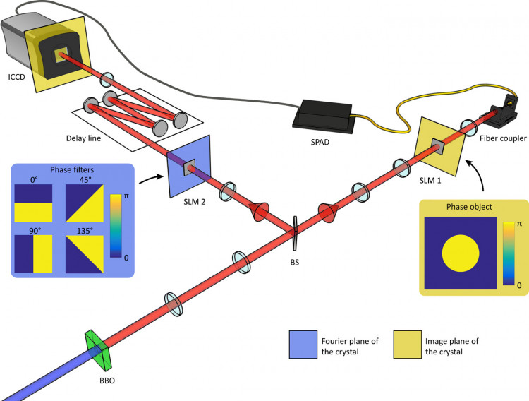 Çan eşitsizliği testi yapılan düzenek Bir ultraviyole lazer tarafından pompalanan BBO kristali, dolaşmış foton çiftlerinin kaynağı olarak kullanılıyor. İki foton bir ışın ayırıcıda (BS) ayrılıyor. Bir SPAD tarafından tetiklenen yoğunlaştırılmış bir kamera, ilk fotonun yoluna yerleştirilen ve diğer kol içine yerleştirilmiş bir SLM (SLM2) üzerinde gösterilebilen dört farklı uzaysal filtre tarafından yerel olmayan bir şekilde filtrelenen bir faz nesnesinin hayalet görüntülerini elde etmek için kullanılıyor. SPAD tarafından tetiklenerek, kamera bir Bell testi yapmak için kullanılabilecek tesadüf görüntülerini yakalıyor. |