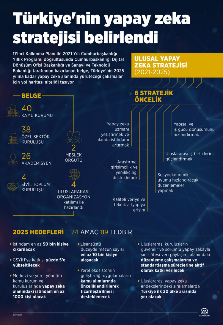 11'inci Kalkınma Planı ile 2021 Yılı Cumhurbaşkanlığı Yıllık Programı doğrultusunda Cumhurbaşkanlığı Dijital Dönüşüm Ofisi Başkanlığı ve Sanayi ve Teknoloji Bakanlığı tarafından hazırlanan belge, Türkiye'nin 2025 yılına kadar yapay zeka alanında yürüteceği çalışmalar için yol haritası niteliği taşıyor.
