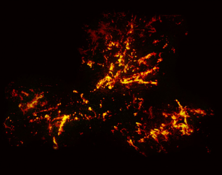 Alttaki görüntüde ise Atacama Büyük Milimetre/milimetre-altı Dizisi (ALMA) tarafından gözlemlendiği şekliyle, Tarantula Bulutsusu olarak da bilinen yıldız oluşum bölgesi 30 Doradus'u radyo dalga boylarında gösterilmektedir. Parlak kırmızı-sarı çizgiler, çökme ve yıldız oluşturma potansiyeline sahip soğuk, yoğun gaz bölgelerini ortaya koyuyor. Gaz bulutlarının benzersiz ağ benzeri yapısı, Tarantula Bulutsusu'na adını veren özelliğidir.