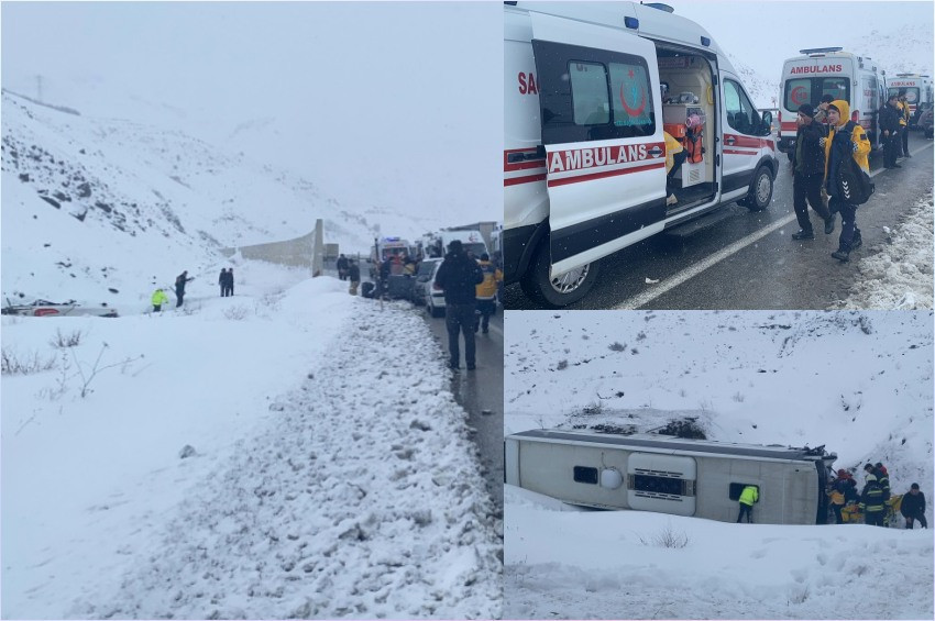 İstanbul'dan cenaze ve cenaze yakınlarını taşıyan otobüs kar yağışının etkili olduğu Erzincan'da yolcu otobüsü şarampole devrildi, bölgeye çok sayıda ambulans ve arama kurtarma ekibi sevk edildi.