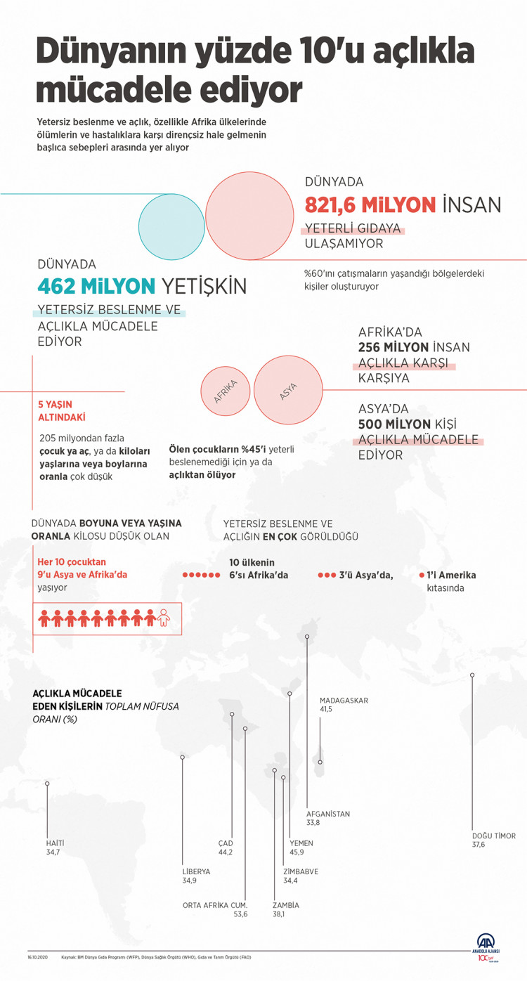 Dünyada 462 milyon yetişkinin yetersiz beslenme ve açlıkla mücadele ettiğini belirten WHO'ya göre, 5 yaşının altındaki 205 milyondan fazla çocuk ise ya aç ya da kiloları, yaşlarına veya boylarına oranla çok düşük. Ölümlerde ise 5 yaşının altında ölen çocukların yüzde 45'i yeterli beslenemediği için ya da açlıktan ölüyor.