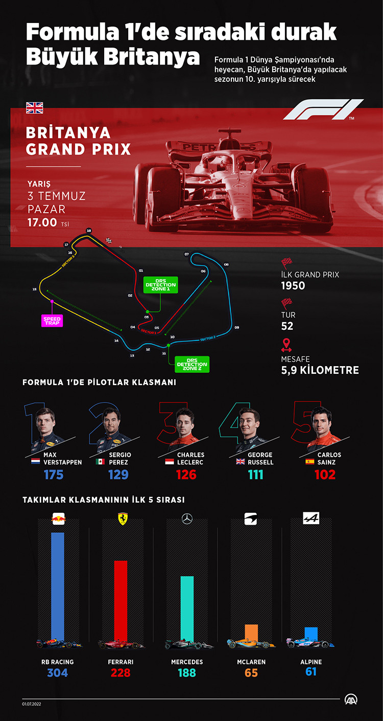 İngiltere'nin Northamptonshire bölgesinde yer alan 5 bin 891 metrelik Silverstone Pisti'nde, 52 tur üzerinden gerçekleştirilecek Büyük Britanya Grand Prix'sinde sıralama turları yarın TSİ 17.00, yarış ise 3 Temmuz Pazar günü TSİ 17.00'de başlayacak.