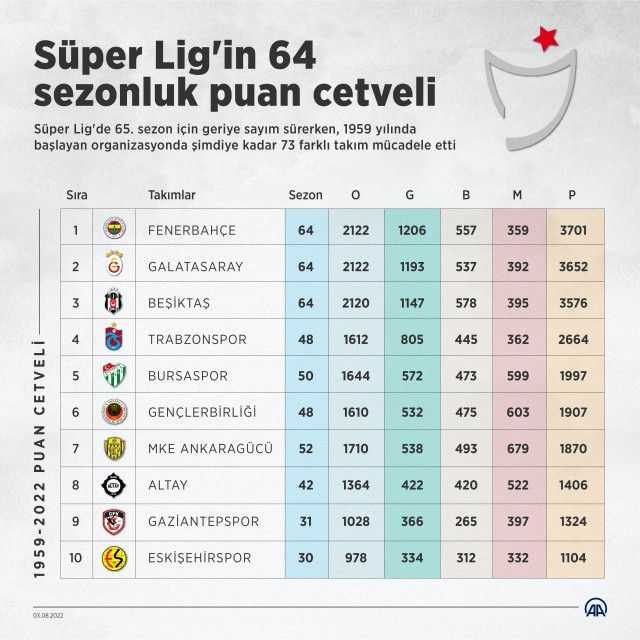 Galatasaray ise 2122 maçta toplam 3652 puan elde etti. Sıralamada Beşiktaş 3576 puanla üçüncü, Trabzonspor da 2664 puanla dördüncü sırada kendisine yer buldu.