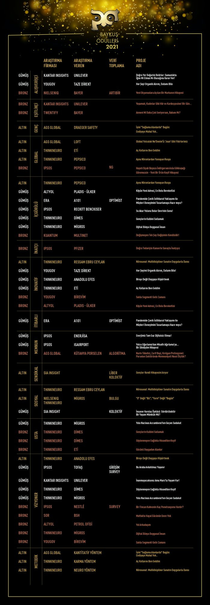 Baykuş Ödülleri’nde bu yıl FMCG, finans, akademi, reklam, araştırma, veri toplama, medya, iletişim, medikal ve sigorta sektöründen oluşan 21 kişilik jürinin 22 – 23 Eylül tarihlerinde 14 kategoride değerlendirdiği 138 başvuru arasından 34 proje 49 ödüle layık görüldü.