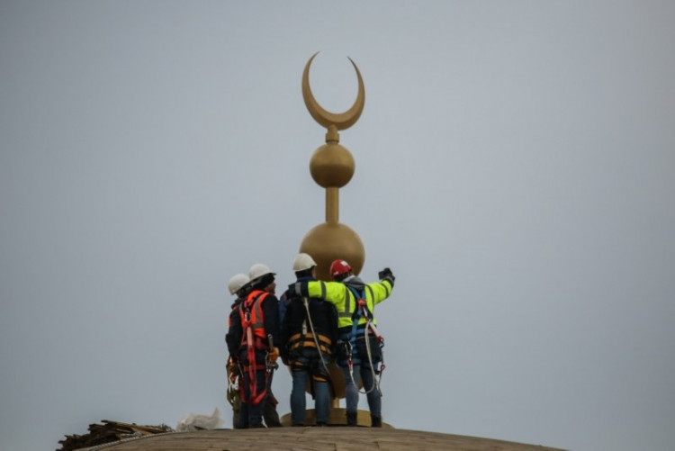 Taksim Meydanı'ndan geçen yerli ve yabancı turistler, alemin fotoğrafını çekti. Yapımı tamamlandığında camide 2 bin 500 kişi aynı anda ibadet edebilecek.