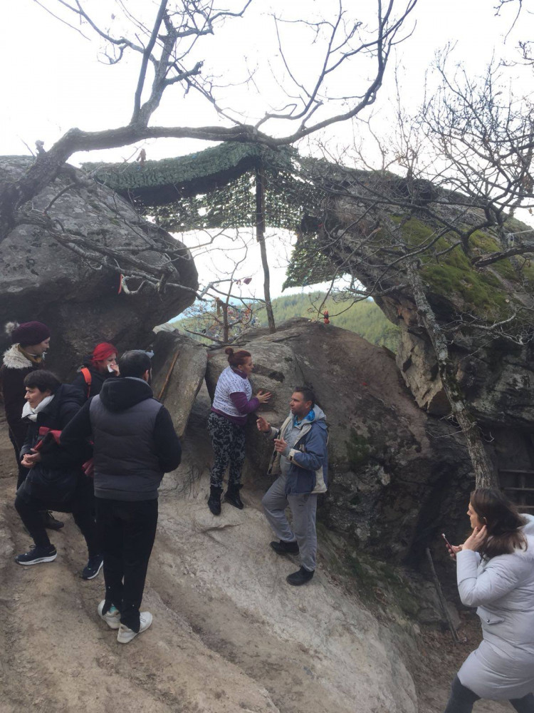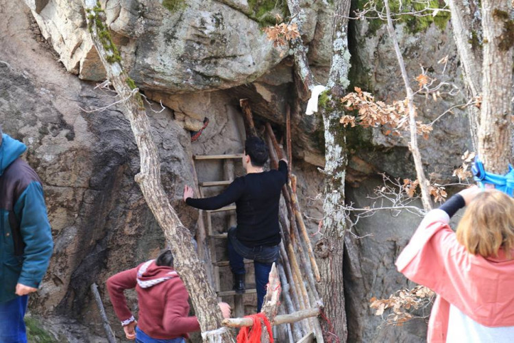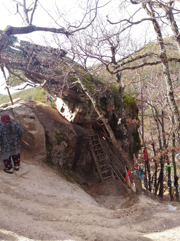 Açıklamaları rehberimiz Renan Hanım, Türkçe’ye çevirdi. Havva Nine daha yüksekte bulunan kayayı işaret ederek anlattı. Kayanın önüne dayanmış el yapımı tahta merdivenden çıkarak delikten geçmemiz gerektiğini. sonra da kayanın üzerinde Havva Nine’nin bulunduğu yerden geçerek anne rahminden doğar izlenimi veren iki taşın arasındaki delikten sol yanımız üzerinde kayarak aşağıya inmemizi söyledi.