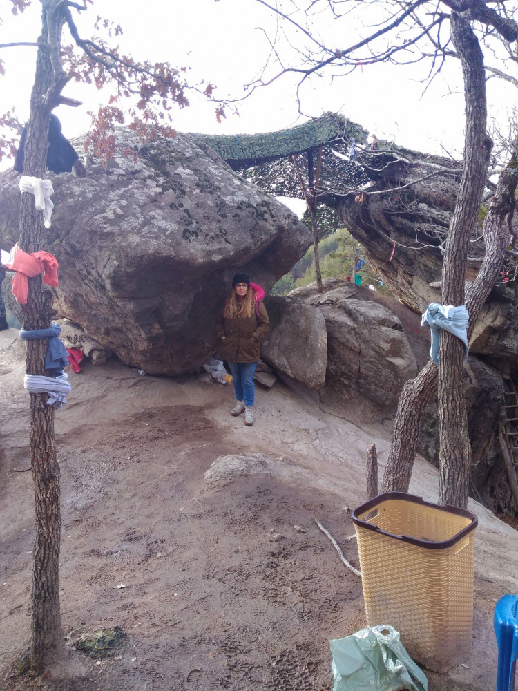 Birkaç dakika sonra bir düzlüğe geldik, etrafımızda kocaman giysili ağaçlar, tam karşımızda ise devasa kayanın üzerine yığılmış birkaç kocaman kaya vardı.