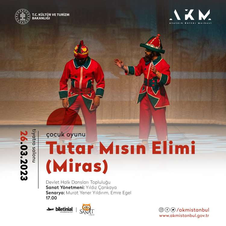 Ülkemizin UNESCO Somut Olmayan Kültürel Miras Listesi'nde yer alan değerlerinin başında gelen Karagöz; müzikli danslı bir oyunla çocuklarla buluşuyor. Yıldız Çankaya’nın sanat yönetmenliğinde, Murat Yener Yıldırım ve Emre Egel’in senaryosunu yazdığı “Tutar mısın Elimi (Miras)” oyunu, 26 Mart Pazar günü AKM Tiyatro Salonunda çocuklar için sahnelenecek. Devlet Halk Dansları Topluluğu tarafından sahneye taşınan oyun, Karagöz’ün kendisine bırakılan mirası bulmak için Hacivat’la birlikte çıktığı Anadolu yolculuğu üzerinden ilerliyor. Nasrettin Hoca’dan Tuzsuz Deli Bekir tiplemesine pek çok farklı karakteri çocuklara tanıtan oyun, gerçek mirasın sahip olduğumuz kültür, sevgi ve dayanışma olduğu vurguluyor.