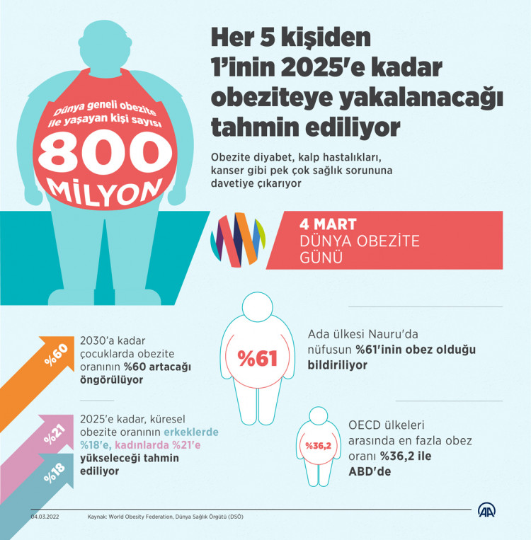 World Obesity Federation’ın yayımladığı raporda ise 2025'e kadar, küresel obezite oranının erkeklerde yüzde 18'e, kadınlarda yüzde 21'e yükseleceği tahmin ediliyor.