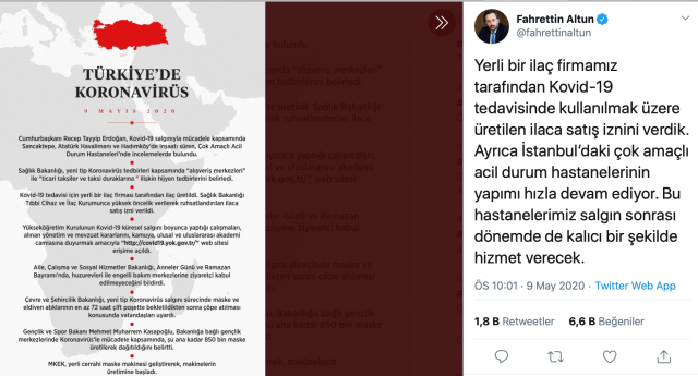 İletişim Başkanı Fahrettin Altun sosyal medya hesabından yaptığı açıklamada, "Yerli bir ilaç firmamız tarafından Kovid-19 tedavisinde kullanılmak üzere üretilen ilaca satış iznini verdik. Ayrıca İstanbul’daki çok amaçlı acil durum hastanelerinin yapımı hızla devam ediyor. Bu hastanelerimiz salgın sonrası dönemde de kalıcı bir şekilde hizmet verecek" dedi.