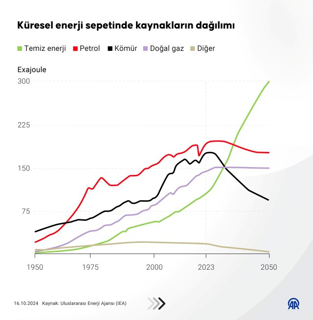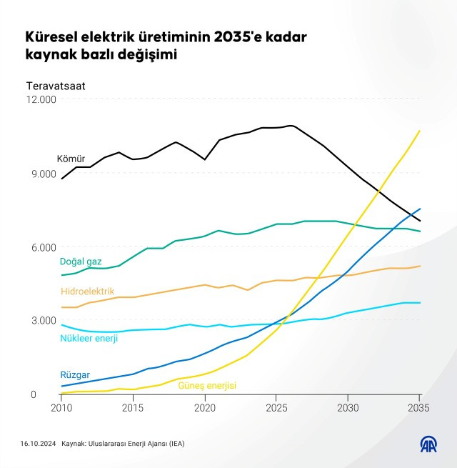 Düşük emisyonlu enerji kaynaklarının 2030'dan önce dünyanın elektrik talebinin yarısından fazlasını üretmesi beklenirken, kömür, petrol ve doğal gaz dahil tüm fosil yakıtlara yönelik talebin 2030 sonu itibarıyla zirveye ulaşması ve sonrasında düşüşe geçmesi bekleniyor.