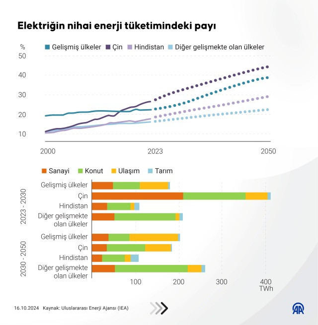 Son 10 yılda küresel elektrik talebi ise enerji talebinin iki katı büyüdü. Dünya elektrik talebinde her yıl Japonya'nın talebine eş değer artışın görüldüğü bu ortamda, "yeni ve daha elektrikli bir enerji sisteminin hatları" belirginleşiyor.