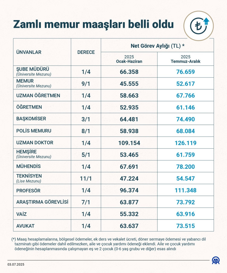 Bu artışlar neticesinde 2025 yılı temmuz dönemi itibarıyla bazı kamu görevlilerinin net görev aylığı şöyle belirlendi: