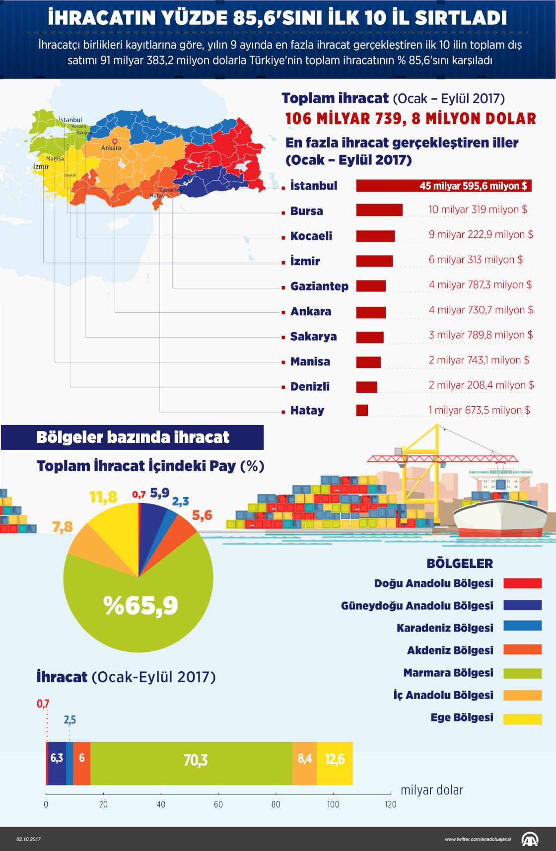 Türkiye'nin ihracatına ocak-eylül 2017 döneminde en büyük katkının 70 milyar 334,1 milyon dolarla Marmara Bölgesi'nden, en az katkının ise 725,4 milyon dolarla Doğu Anadolu Bölgesi'nden geldiği görüldü.