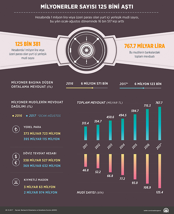 BDDK verilerine göre, milyonerlerin sayısı bu yılın ağustos sonu itibarıyla 2016 sonuna kıyasla 16 bin 517 kişi artarak 125 bin 381'e ulaşırken, toplam mevduatları da 767 milyar 721 milyon lira oldu.