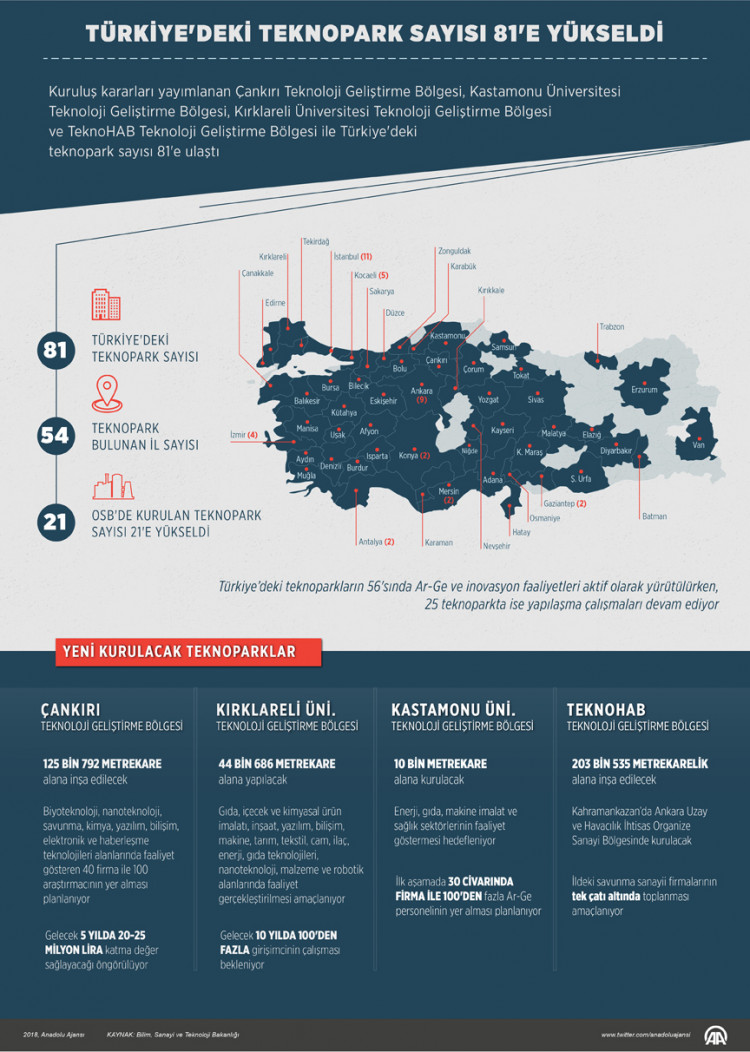 Bilim, Sanayi ve Teknoloji Bakanı Faruk Özlü, Resmi Gazete'de kuruluş kararları yayımlanan Çankırı Teknoloji Geliştirme Bölgesi, Kastamonu Üniversitesi Teknoloji Geliştirme Bölgesi, Kırklareli Üniversitesi Teknoloji Geliştirme Bölgesi ve TeknoHAB Teknoloji Geliştirme Bölgesi ile Türkiye'deki teknopark sayısının 81'e ulaştığını bildirdi.