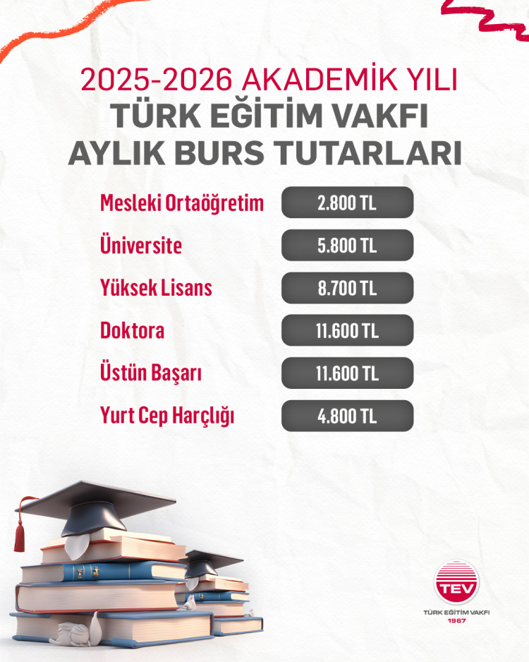 2025–2026 akademik yılı burslarına ilişkin yeni kararlarını kamuoyuyla paylaşan TEV, eğitimde fırsat eşitliğini destekleme misyonuyla burs tutarlarını yeni dönemde artırdı. 20.000’i aşkın öğrencinin öğrenim hayatını kesintisiz sürdürebilmesi amacıyla burs programlarını sürdüren Vakıf, aynı zamanda TEV Tamamlayıcı Bursları kapsamında TEV bursiyerlerine sunduğu yemek, kırtasiye ve ulaşım destekleriyle gençlerin okul ve sosyal yaşamlarını kolaylaştırmayı hedefliyor.