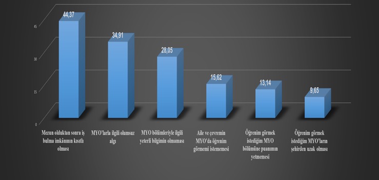 Meslek yüksekokullarını (MYO) tercih etmeme nedenleri arasında ise ilk sırayı "mezun olduktan sonra iş bulma imkanının kısıtlı olması", 2'nci sırayı "MYO'larla ilgili olumsuz algı", 3'üncü sırayı ise "MYO bölümleriyle ilgili yeterli bilgisinin olmaması" faktörü etkili oldu.