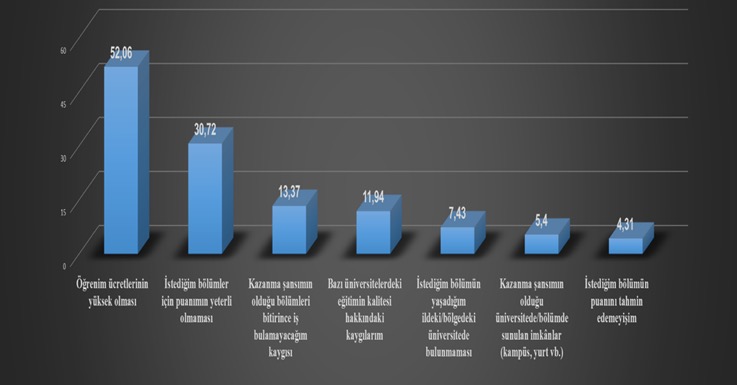Adayların devlet üniversitesini tercih etmeme nedenlerini belirleyen faktörler arasında ilk sırayı yüzde 65,73 oranla "öğrencinin istediği bölümler için puanının yeterli olmaması", 2'nci sırayı yüzde 27,39 oranla "kazanma şansının olduğu bölümleri bitirince iş bulamayacağı kaygısı", 3'üncü sırayı ise yüzde 13,23 oranla "bazı üniversitelerdeki eğitimin kalitesi hakkındaki kaygılar" aldı.