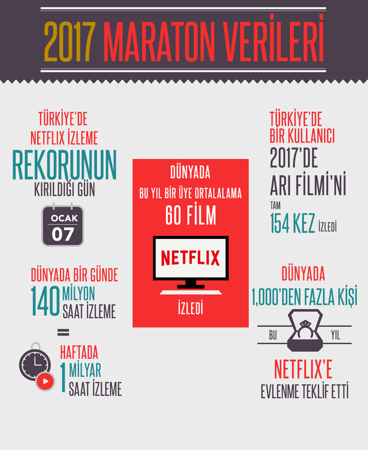 Türkiye’de bir kullanıcı 2017’de Arı Filmi’ni (Bee Movie) tam 154 kez izledi. Dünya genelinde bir üye yılda ortalama 60 film seyretti.