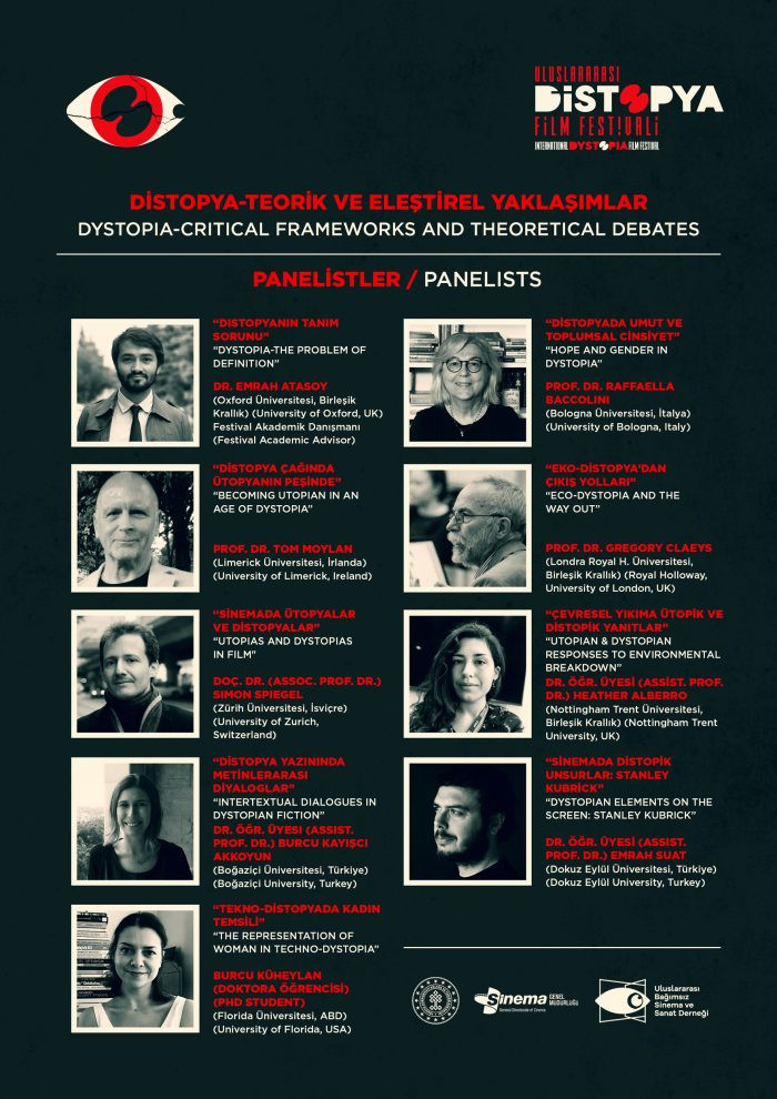 Panellerde; festivalin akademik danışmanlığını gerçekleştiren Oxford Üniversitesi’nden; Festival Akademik Danışmanı ve Oxford Üniversitesi’nden Dr. Emrah Atasoy “Distopyanın Tanım Sorunu”, Bologna Üniversitesi’nden Prof. Dr. Raffaella Baccolini “Distopyada Umut ve Toplumsal Cinsiyet”, Limerick Üniversitesi’nden Prof. Dr. Tom Moylan “Distopya Çağında Ütopyanın Peşinde”, Zürih Üniversitesi’nden Doç. Dr. Simon Spiegel “Sinemada Ütopyalar ve Distopyalar”, Nottingham Trent Üniversitesi’nden Dr. Öğr. Üyesi Heather Alberro “Çevresel Yıkıma Ütopik ve Distopik Yanıtlar”, Boğaziçi Üniversitesi’nden Dr. Öğr. Üyesi Burcu Kayışcı Akkoyun “Distopya Yazınında Metinlerarası Diyaloglar”, Dokuz Eylül Üniversitesi’nden Dr. Öğr. Üyesi Emrah Suat “Sinemada Distopik Unsurlar: Stanley Kubrick”, Florida Üniversitesi’nden Doktora Öğrencisi Burcu Küheylan “Tekno-Distopyada Kadın Temsili” ve Londra Royal H. Üniversitesi’nden Prof. Dr. Gregory Claeys “Eko-Distopya’dan Çıkış Yolları” konularını ele alacak.