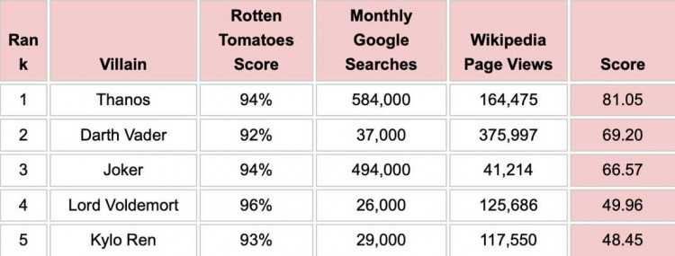 Listenin liderlik koltuğuna oturan karakter, Marvel Sinematik Evreni’nden Thanos oldu. Thanos’un yer aldığı Avengers: Endgame filmi Rotten Tomatoes’ta 94/100 puan almayı başardı. Google’da aylık 584 bin kez aranan Thanos’un Wikipedia sayfasıysa 164 bin 475 kez görüntülendi.