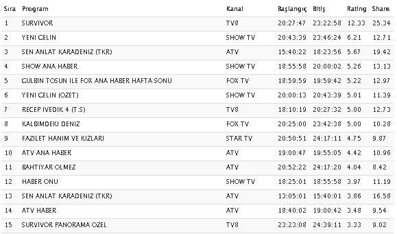 Survivor’la beraber Cumartesi akşamının zirve için reyting mücadelesi veren yapımları arasında Fazilet Hanım ve Kızları, Gülizar, Yeni Gelin gibi önemli diziler bulunuyordu. Ama hiçbir dizi zirveyi Survivor’un elinden kapamadı.