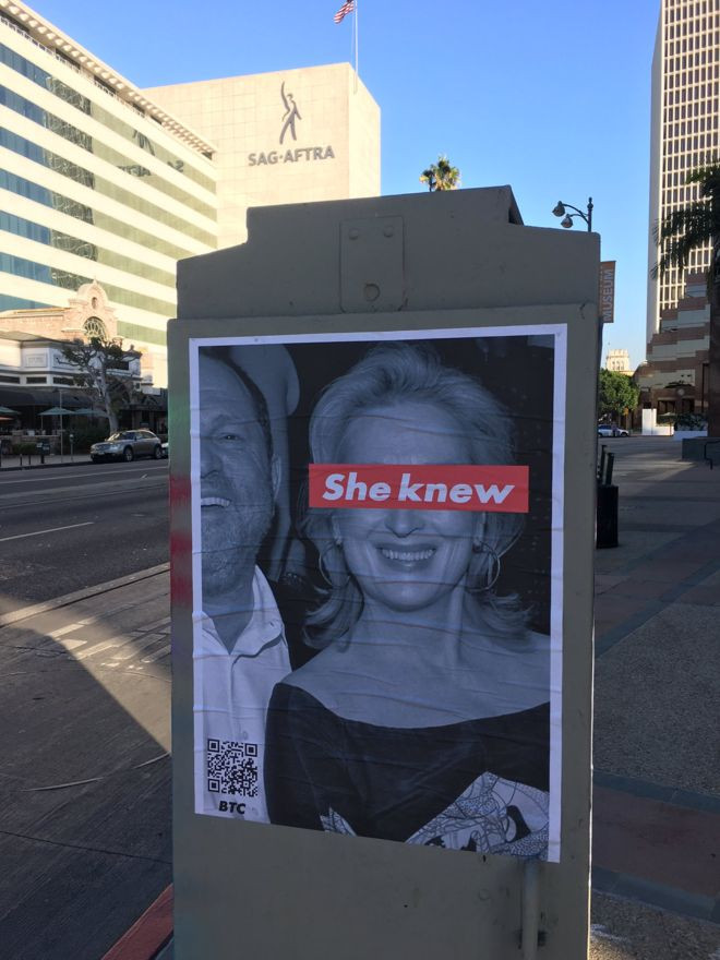 Son 24 saat içinde ise Los Angeles kentinin farklı noktalarında Meryl Streep'in fotoğrafları üzerine "Biliyordu" yazısıyla asılan afişler boy göstermeye başladı.