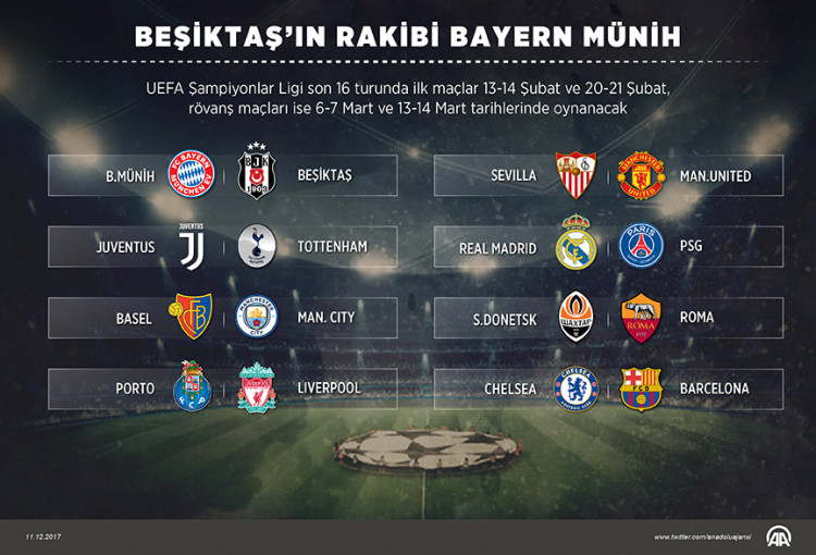 UEFA Şampiyonlar Ligi son 16 turunda Beşiktaş, Almanya'nın Bayern Münih takımıyla eşleşti.