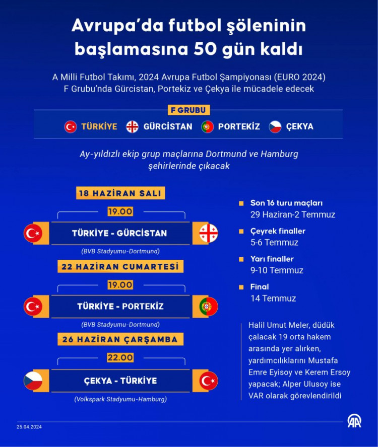 Turnuvada 5-6 Temmuz'da çeyrek final ve 9-10 Temmuz'da da yarı final maçları oynanacak. EURO 2024'ün şampiyonu, 14 Temmuz'da Berlin Olimpiyat Stadı'nda oynanacak final maçıyla belli olacak.