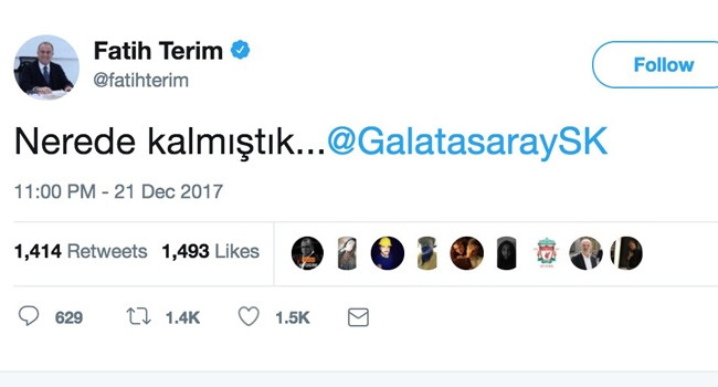 Fatih Terim de kendisine ait Twitter hesabından "Nerede kalmıştık...@GalatasaraySK" paylaşımında bulundu.