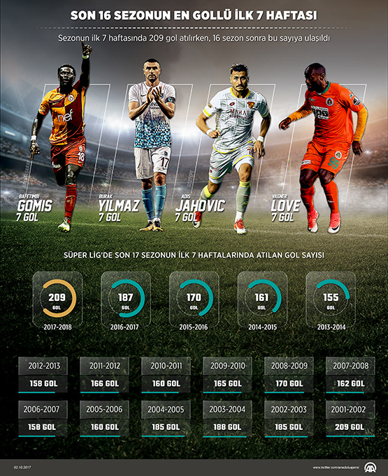 Ligin ilk 7 haftasında yapılan 63 maçta 209 kez gol sevinci yaşandı. Ligde son olarak 2001-2002 sezonunun 7. haftasında toplam 209 gol atılırken, 16 sezon sonra bu sayıya ulaşıldı.