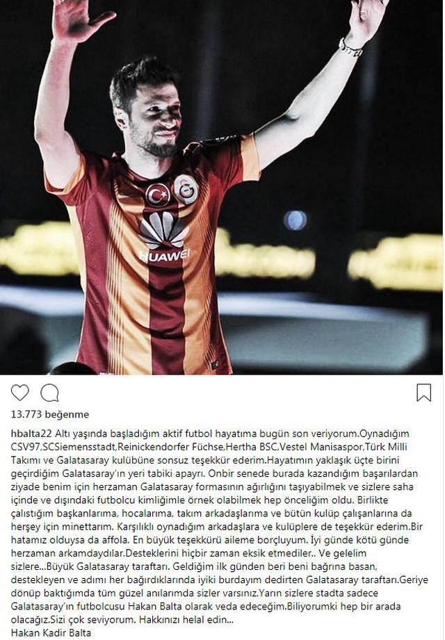 Galatasaray'da bir devir sona erdi. 2007 yılında Manisaspor'dan Galatasaray'a transfer olan ve 11 sezon Sarı Kırmızılı formayı giyen Hakan Balta instagram hesabından futbol hayatına son verdiğini açıkladı. Balta, "Yarın sizlere statta sadece Galatasaray’ın futbolcusu Hakan Balta olarak veda edeceğim." dedi. Galatasaray yönetimi Türk Telekom Stadı'nda taraftarla vedalaşacak 35 yaşındaki Hakan'ı sarı-kırmızılı kulüp, hizmetlerinden dolayı plaketle onore edecek.