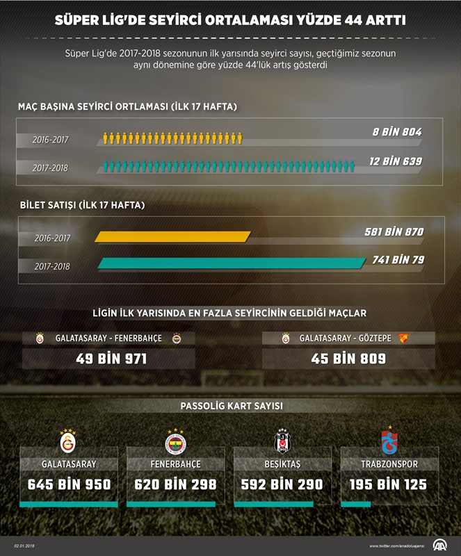Ligde bilet satış rakamları da yüzde 27 arttı. 2016-2017 sezonunda ilk 17 haftada 581 bin 870 bilet satılırken, bu sezon aynı dönemde yüzde 27'lik bir artışla 741 bin 79 bilet satışı yapıldı.