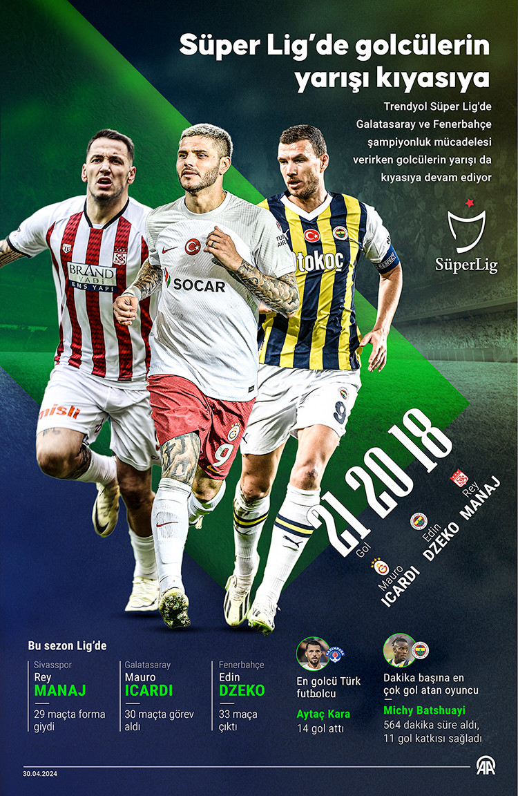 Şampiyonluk yarışında 93 puanla zirvede bulunan Galatasaray'ı, 89 puanla Fenerbahçe takip ederken gol krallığı yarışında sarı-kırmızılıların golcüsü Mauro Icardi, 34. hafta itibarıyla 21 golle, Fenerbahçeli Edin Dzeko'nun (20) önüne geçti.
