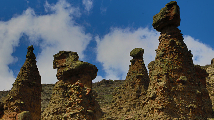 Vadide yer alan 150'ye yakın peribacasının, tortul kayaların su ve rüzgar erozyonuna uğraması sonucu oluştuğunu anlatan Ayhan, bu yapıların yoğun olarak Orta ilçesi Sakaeli köyüne 6 kilometre uzaklıktaki Gelin Kayaları bölgesinde bulunduğunu belirtti.