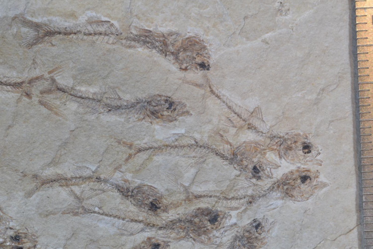 Kocaman dinozor iskeletlerinin yanında ziyaretçilerin pek dikkatini çekmeyen kireçtaşı şeylinin içine gömülmüş 50 milyon yıllık fosil açıkça olağanüstüydü: Erismatopterus levatus cinsi nesli tükenmiş 259 küçük balık gövdesi, gözleri ve dikenleri ve hatta yüzgeçleri ile birlikte fosilleşmişti ve birkaçı hariç hepsi, aynı yöne yüzüyordu.