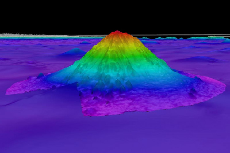 | Şili açıklarındaki Solito Denizdağı’nın batimetrik haritası. Harita, Falkor Araştırma Gemisi’nden alınan çok ışınlı sonar verilerle oluşturulmuş. Bu haritada daha sıcak renkler (kırmızı ve turuncu) daha sağ alanlara karşılık gelirken, daha soğuk renkler (sarı, yeşil ve maviler) daha derin bölgeleri gösteriyor. Seferdeki bilim insanları her denizdağının, derin denizlerde büyüyen mercan kayalıkları ve sünger bahçeleri de dahil ayrı bir ekosisteme ev sahipliği yaptığını keşfetmiş. Bu durum, denizdağlarının çok sayıda savunmasız deniz habitatını desteklediğini gösteriyor. Fotoğraf: Schmidt Okyanus Enstitüsü. |