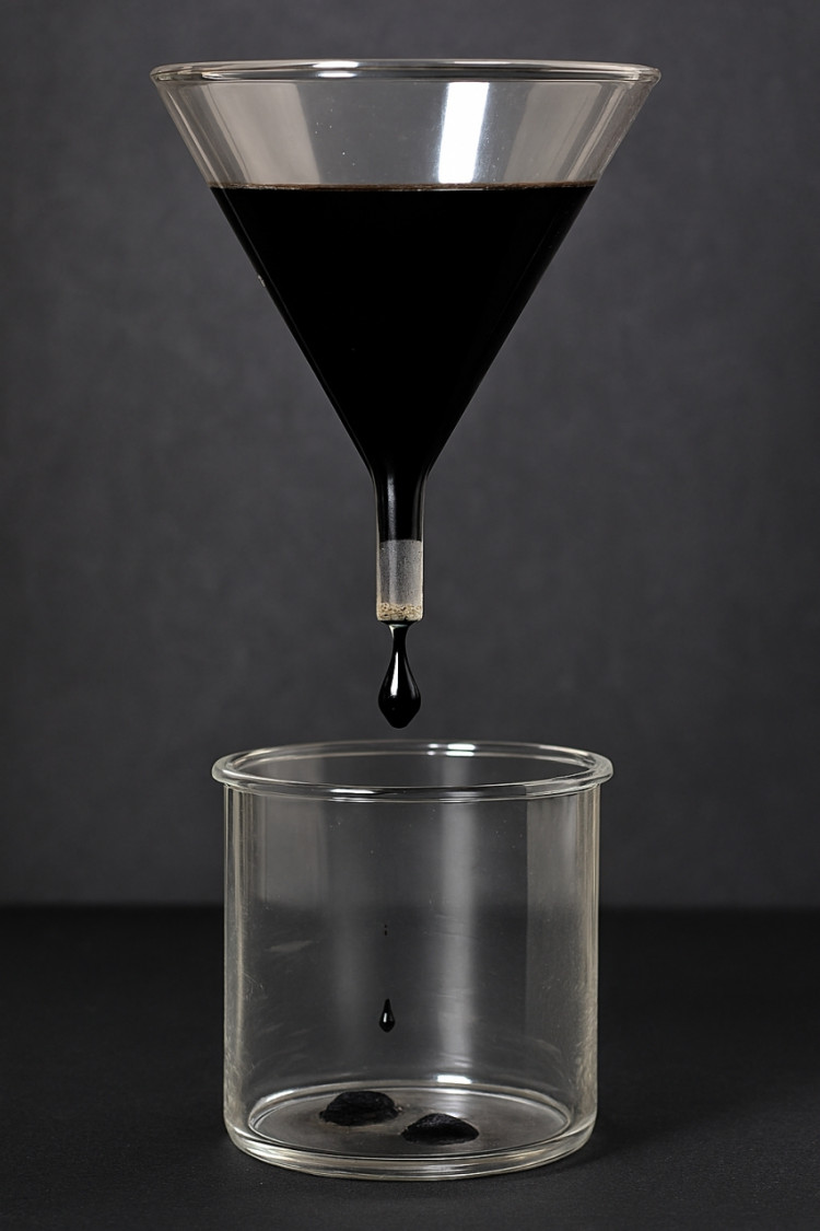 Parnell, ısıtılmış zift örneğini, ucu mühürlenmiş cam bir huniye döktü.