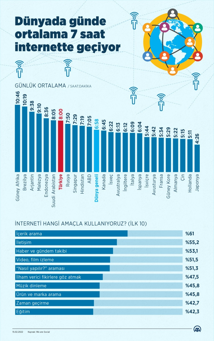 İnternette en çok zaman geçiren ülkeler arasında Türkiye 8. sırada yer alırken il 7 sırayı; Güney Afrika, Brezilya, Arjantin, Malezya, Endonezya ve Suudi arabistan paylaşıyor. Türkiye'nin altına kalan ülkeler ise Rusya, Singapur, Hindistan ve ABD şeklinde sıralanıyor.