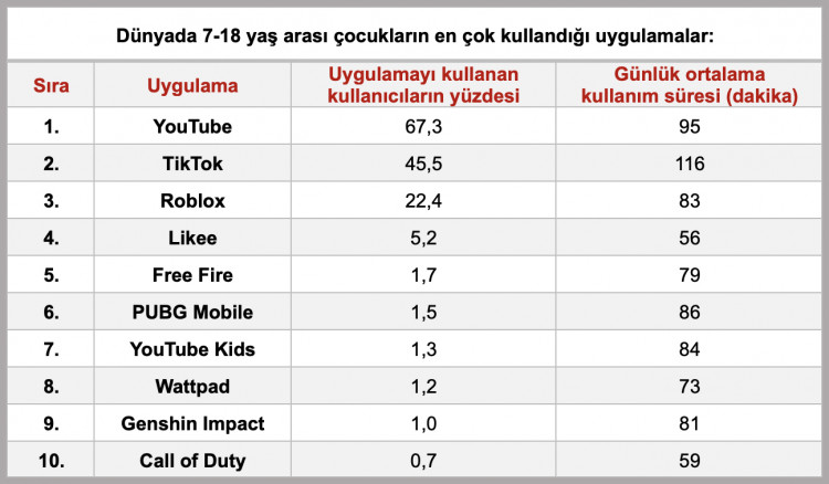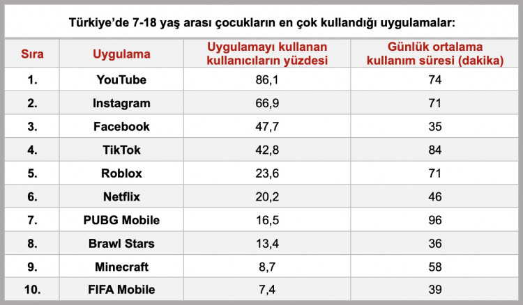 Türkiye’de çocukların cep telefonlarında en çok kullandıkları uygulama kategorisi sosyal medya olurken, onu mobil oyunlar izledi. İlk onda yer alan dört sosyal medya uygulamasından her birinde günde ortalama 66 dakika geçiren çocukların mobil oyuna ayırdığı süre de oyun başına ortalama 65 dakikayı buluyor. Ülkemizdeki çocukların en çok kullandığı sosyal medya uygulamaları YouTube, Instagram, Facebook ve TikTok olarak sıralanıyor. Oyun uygulamalarında ise sıralama Roblox, PUBG Mobile, Brawl Stars, Minecraft ve FIFA Mobile şeklinde. Film, dizi ya da çizgi film izlemek isteyen çocukların cep telefonlarındaki Netflix kullanım süreleri günde ortalama 46 dakikaya ulaşıyor.