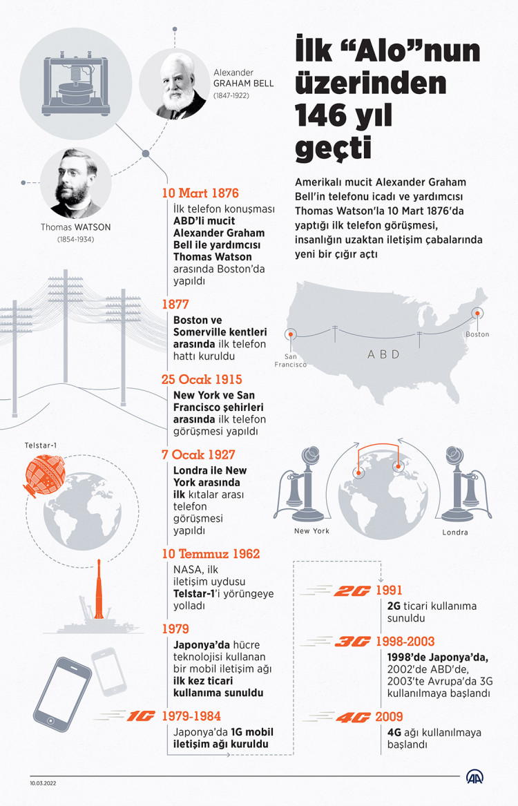 Tarihteki ilk telefon konuşması 10 Mart 1876'da ABD'li mucit Alexander Graham Bell ile yardımcısı Thomas Watson arasında Boston'da yapıldı.