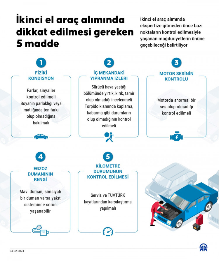 İkinci el araç alımında ekspertize gitmeden önce başta fiziki görünüm, iç mekandaki deformeler ve kilometre durumu olmak üzere bazı noktaların kontrol edilmesinin yaşanan mağduriyetlerin önüne geçebilir.