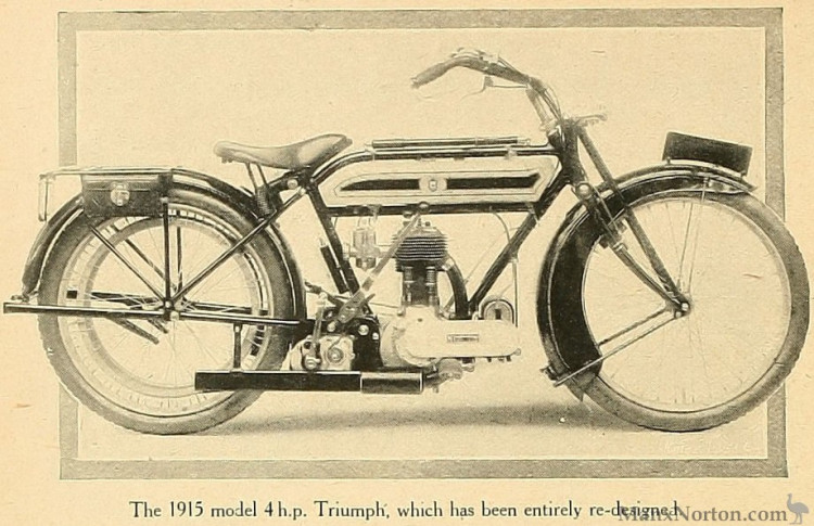 Diğer birçok motorsiklet üreticisi gibi Triumph da imalata bisikletle başladı ve kullandığı motorları Minerva gibi şirketlerden satın aldı. Şirket, motosiklet ve scooterlar için tek, çift, üçlü ve dört silindirli motorlar üretti. 1960'lar ve öncesinde revaçta olmaları, modellerinin çoğunun koleksiyonerlerin önemli parçaları haline gelmesini sağladı. 2 1/4 hp'lik Triumph "Junior" ilk kez 1913'de üretildi ve bu şekliyle imalatına 1922'ye kadar devam edildi. Junior'un silindir şeklindeki benzin deposu ve önündeki süspansiyon yayı yıllarca bu markanın en belirgin özellikleri oldu.