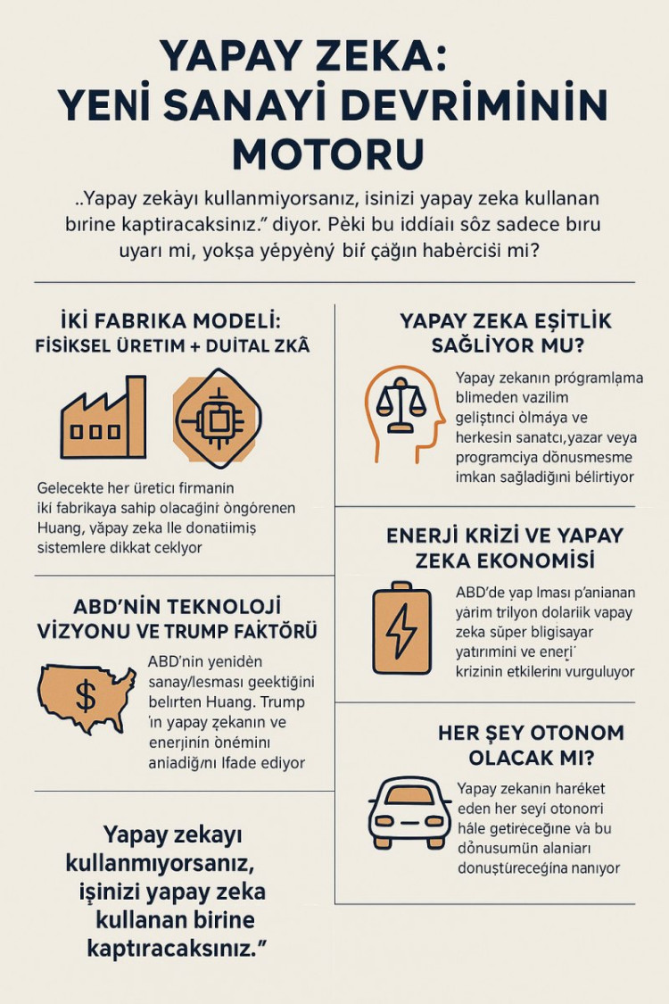 Anadolu Ajalnsından Sevgi Ceren Gökkoyun'un haberine göre; Huang’ın öne sürdüğü en çarpıcı kavramlardan biri, gelecekteki her üretici firmanın “iki fabrikaya” sahip olacağı görüşü. Bu fabrikalardan biri fiziksel ürünleri –örneğin otomobilleri– üretirken, diğeri ise yapay zeka modellerini ve dijital sistemleri geliştirecek.