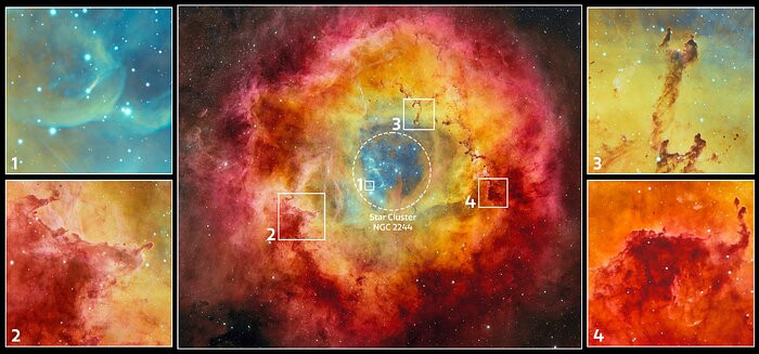 Yaklaşık 5000 ışık yılı uzaklıktaki Rozet Bulutsusu, yıldızlar arası ortamdan dışarı doğru çiçek açıyor gibi görünüyor. Bu kozmik çiçeğin parlayan merkezi boşluğundan gölgeli filamentlerine ve küreciklerine kadar her ayrıntısı,