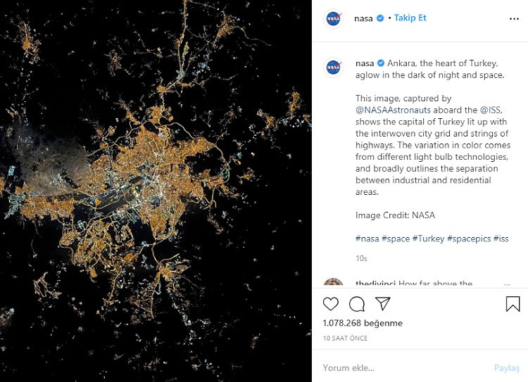 Fotoğrafın açıklamasında ise "ISS'de görevli NASA astronotları tarafından çekilen bu fotoğrafta, elektrik ışıklarının ağ gibi ördüğü ve ip gibi uzanan otoyollarla birbirine bağladığı Türkiye'nin başkenti görülüyor. Işık renklerindeki farklılık, değişik ampül türlerinin kullanılmasından kaynaklanıyor ve sanayi bölgeleri ile yerleşim yerlerini birbirinden ayırıyor." ifadeleri kullanıldı.