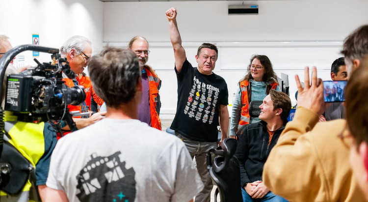 Rubin Gözlemevi İnşaat Projesi Direktörü Željko Ivezić, NSF–DOE Vera C. Rubin Gözlemevi'ndeki İlk Foton etkinlikleri sırasında yumruğunu sallayarak kutlama yapıyor.