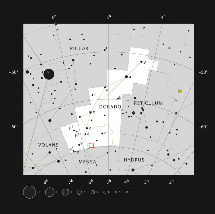 Resmin tepesindeki Tarantula Bulutsusu, 1000'den fazla ışık-yılı kapsıyor. Uzak güney gökyüzünde Dorado (Yunus Balığı) takımyıldızı, yaklaşık 14.000 ışıkyılı uzunluğunu ölçen bir cüce gökadası olan Büyük Macellan Bulutsusunun bir parçası. Büyük Macellan Bulutu, ise Samanyolu'nun en yakın gökadalarından biri.