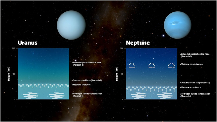 Journal of Geophysical Research: Planets (Jeofizik Araştırması Haberleri: Gezegenler) adlı bilimsel dergide bu ay yayınlanan konuyla ilgi makaleye göre; Oxford Üniversitesi'nde Gezegen Fiziği Profesörü Patrick Irwin'in liderliğindeki astronomi ekibinin geliştirdiği Neptün ve Uranüs'ün atmosferlerindeki aerosol katmanlarını tanımlamak için geliştirdiği modele dayalı araştırma, gezegen atmosferlerinin belirli dalga boylarında görünümüne odaklanmıştı. Araştırma sırasında daha önce yalnızca metan ve hidrojen sülfür buzlarından oluşan bulutları içerdiği düşünülen gezegen atmosferinin daha derin katmanlardaki pus parçacıkları olduğu da görüldü.